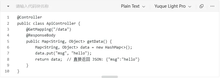 修饰方法或类,表示该方法的返回值不走视图解析器(如 ThymeleafViewResolver),而是通过 HttpMessageConverter(通常 Jackson)直接序列化成响应体内容(JSON/XML 等)。