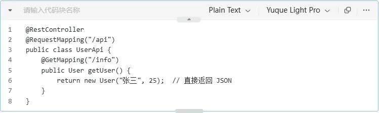 是 @Controller + @ResponseBody 的组合注解(@RestController = @Controller + @ResponseBody)。修饰类,表示该 Controller 所有方法返回值都直接写入响应体(默认 JSON),专用于 REST API。