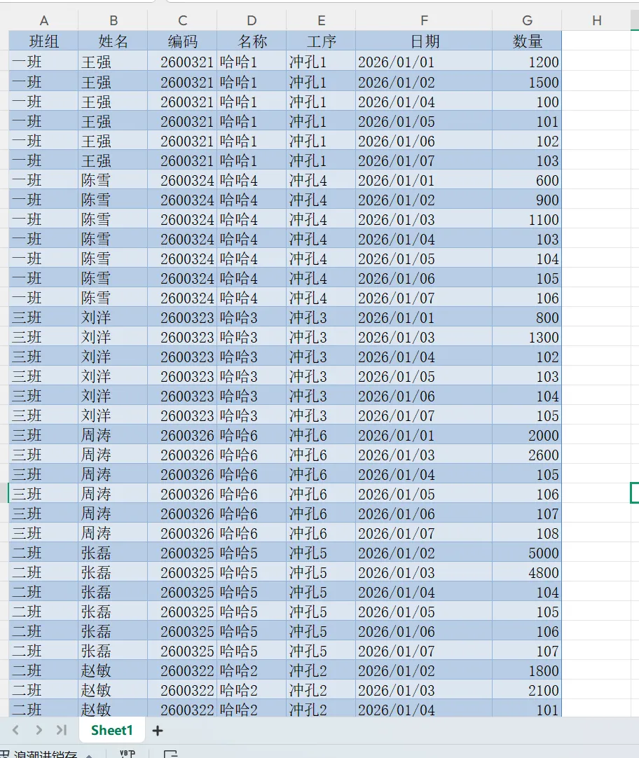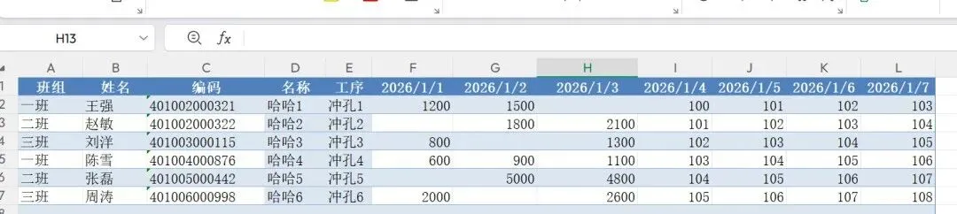 今天为大家分享的是,在生产日报Excel是工厂日常最常用的报表之一,常规格式大多是这样:前几列固定记录班组、姓名、工序等基础信息,后续一长串列均为日期,每列填写对应日期的生产产量。