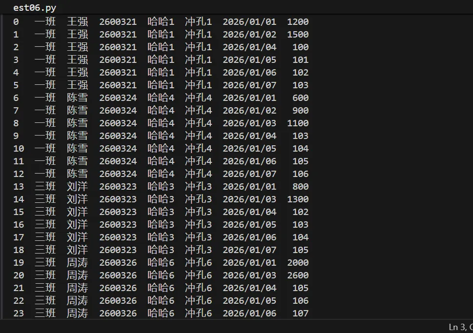 # 宽表转长表:固定维度字段,合并日期与产量列df_long = pd.melt( df,# 固定不变的基础维度列(可根据实际表格字段调整) id_vars=['班组', '姓名', '编码', '名称', '工序'],# 转换后日期字段的列名 var_name='日期',# 转换后产量数值的列名 value_name='数量')