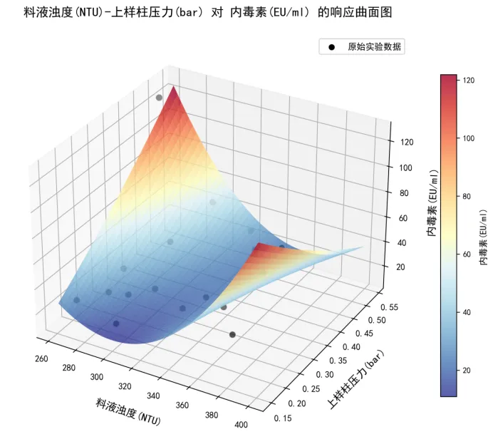 •双参数存在拮抗协同作用:交互项系数-3.3551(负向),当上样柱压力小幅波动时,可将料液浊度调控至280~300NTU区间,抵消部分压力升高带来的内毒素上升影响,为工艺协同调控提供明确方向。