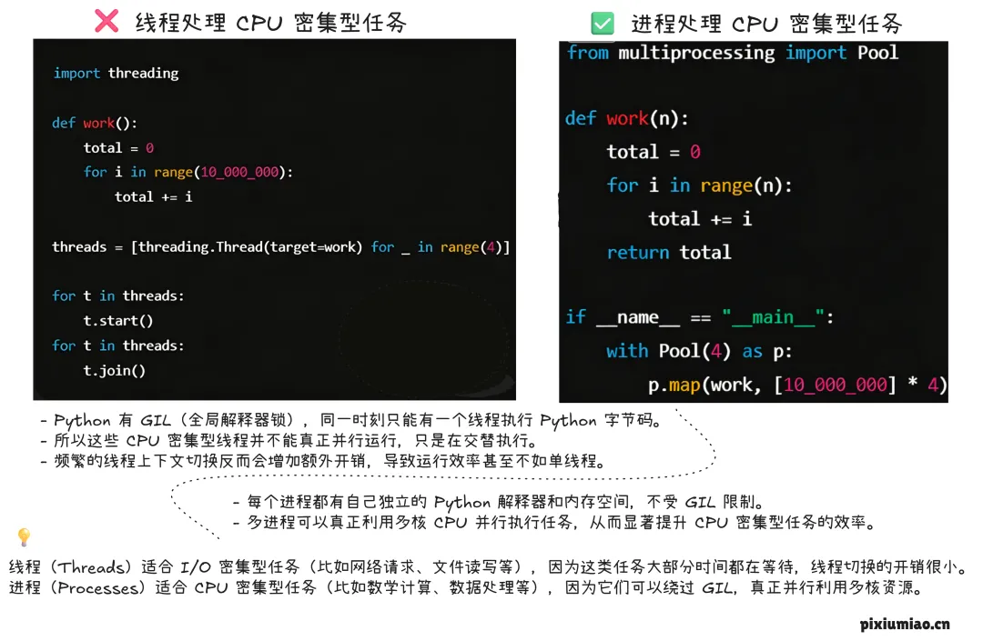 针对CPU密集型任务,正确的做法是改用多进程(multiprocessing)。右边的代码使用multiprocessing.Pool,通过多进程来处理同一个累加任务。
