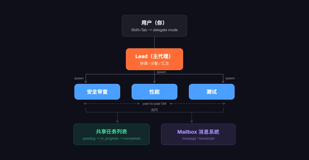 Lead(主代理):你当前的 Claude Code session。负责创建团队、分配任务、协调工作。可以按 Shift+Tab 进入 delegate mode——只协调不干活,防止 lead 自己忍不住开始写代码。