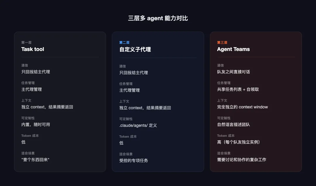 这里要澄清一下。Claude Code 里其实有三层"多 agent"能力: