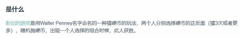 最近刷视频的时候刷到了一个彭尼游戏。大致的规则就是两个人每个人都预测一个长度为3的硬币的组合,然后看硬币先满足哪个人的组合,哪个人就获胜。比如A预测硬币组合为正面,正面,正面,B预测硬币组合反面,正面,正面。这时候开始不断抛硬币,直到A和B有一个人猜测的组合和硬币最近三次的结果完全相同,则此人获胜。