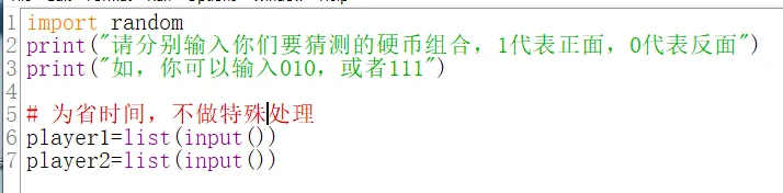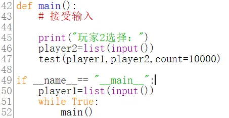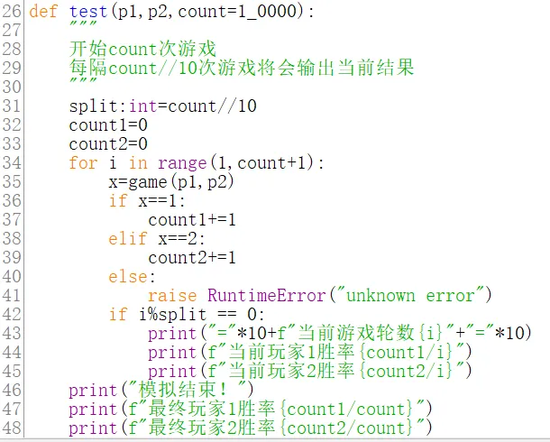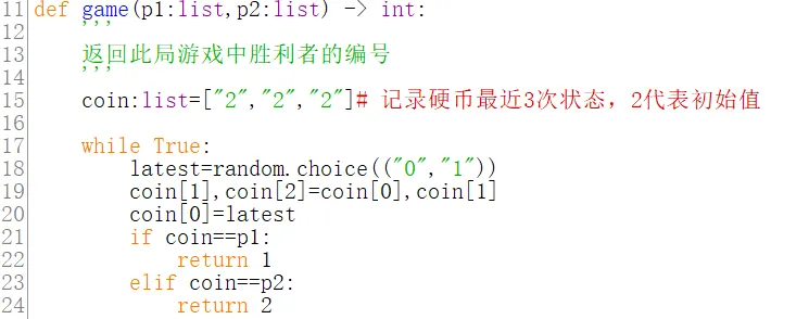 然后,我们定义一个函数game,它接受两个参数:玩家1的选择,玩家2的选择。然后不断地“抛硬币”,直到有一个人胜利,返回胜利者的编号(1或2)
