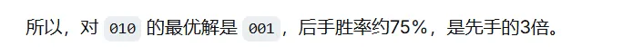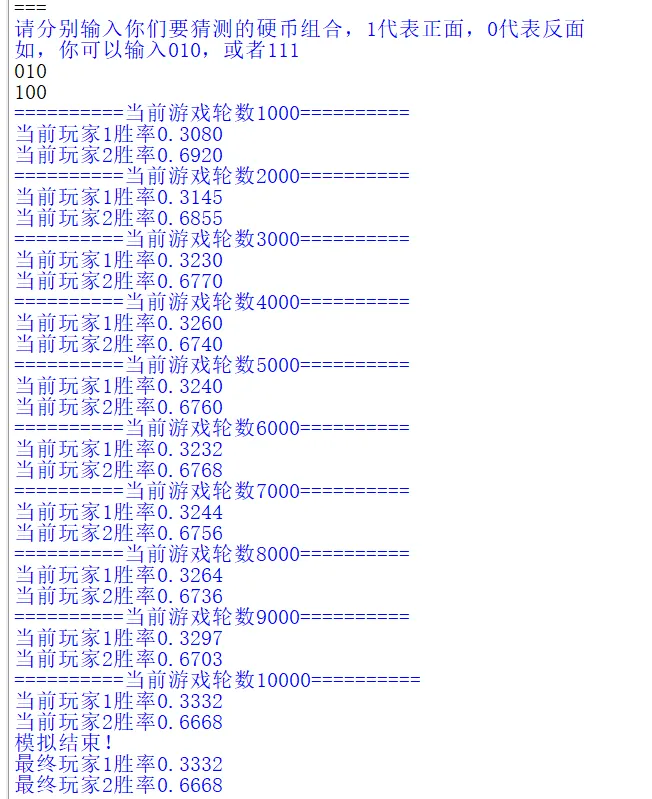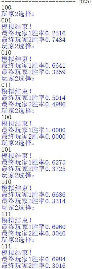 我们还发现,网络上一些文章说,“对于每一种组合,都有一个方法可以使自己的胜率为对方的三倍。”这是假的。001,010这种无法达到3倍,最多只能两倍,暴力模拟出来的,绝对准确