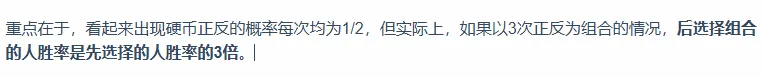乍一看很公平是吧(假设完全不存在假硬币的问题),但是这个游戏最终的结果却令人大跌眼睛:后选择组合的人总是可以比先选择组合的人胜率大。