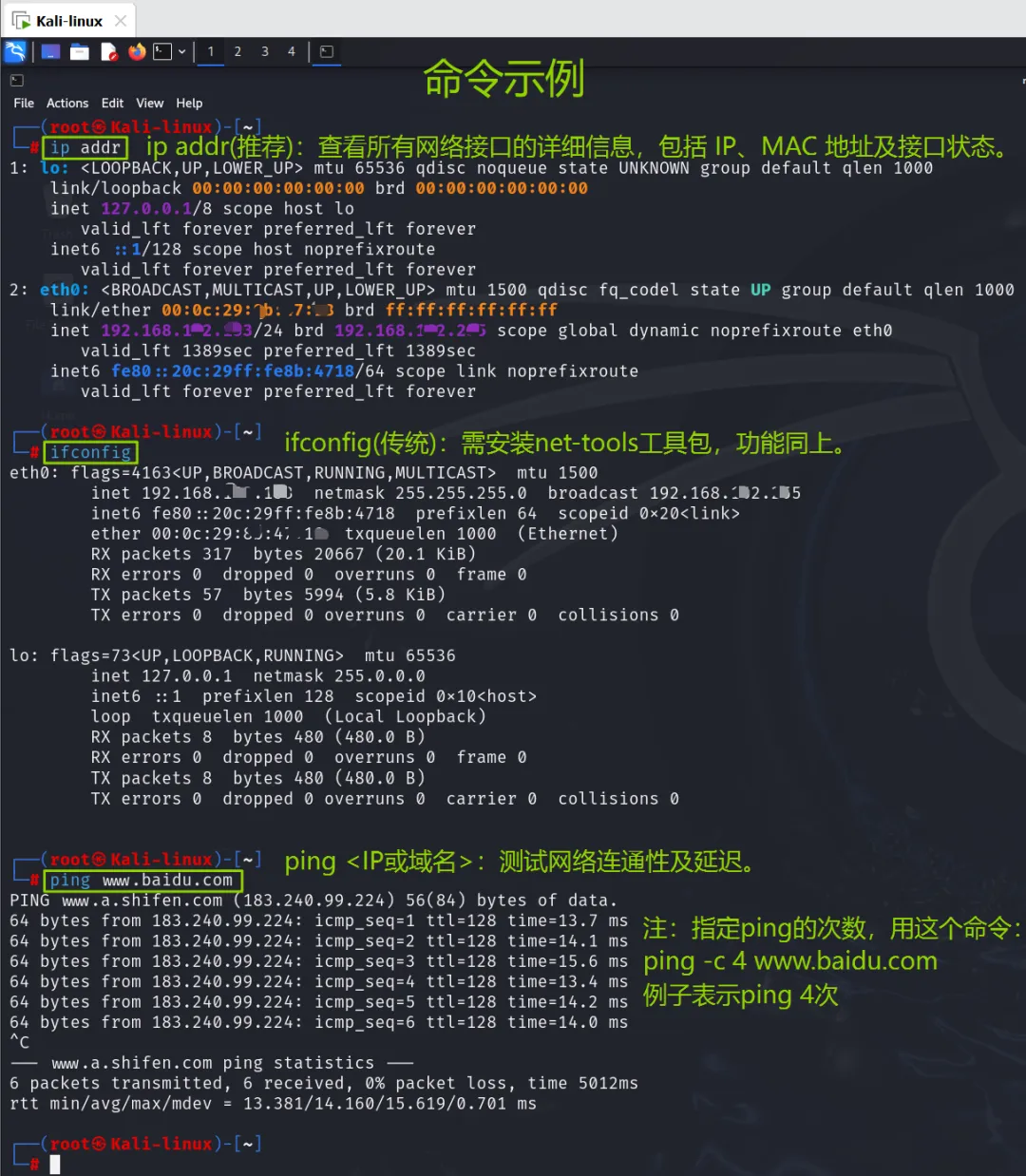 ip addr(推荐):查看所有网络接口的详细信息,包括 IP、MAC地址及接口状态。ifconfig(传统):需安装net-tools工具包,功能同上。ping <IP或域名>:测试网络连通性及延迟。