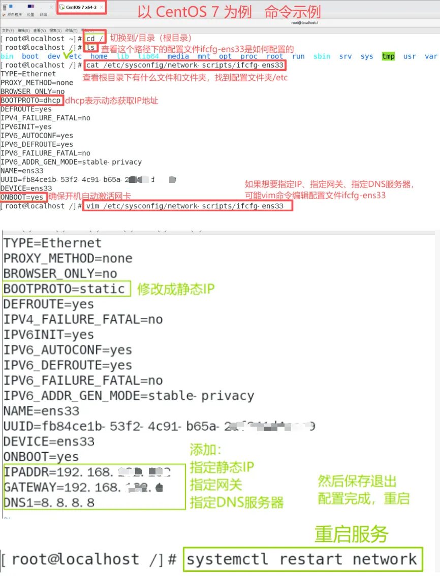 BOOTPROTO=static(静态IP) 或 dhcp(动态获取)IPADDR=192.168.x.x (指定静态 IP)GATEWAY=192.168.x.x(指定网关)