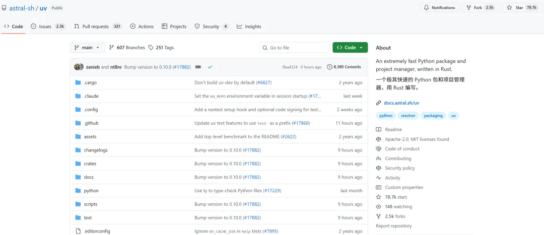 截至2024年,uv在GitHub已获得 10k+ Star,成为Python生态系统中最受关注的工具之一。项目遵循 MIT 开源协议,正在快速成为Python开发者工具链的新标准。