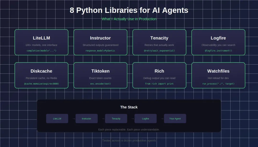 组合小而专的智能体开发工具库,也许是替换复杂抽象智能体框架的另一种选择:LiteLLM 负责模型调用,Instructor 负责结构化输出,Tenacity 负责重试。