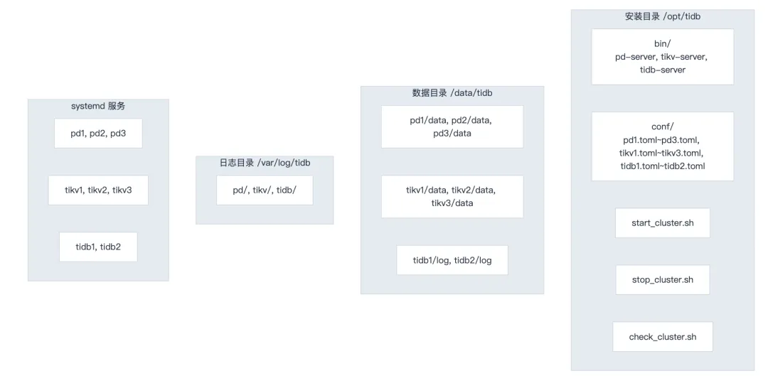 - 安装目录:/opt/tidb(包含二进制、配置、管理脚本)