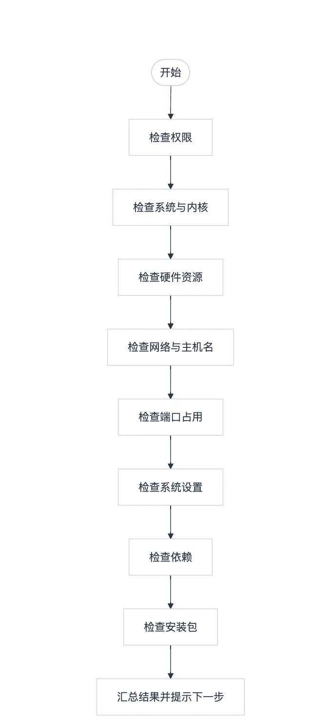 - 输出:统计 PASS/WARN/FAIL,并给出开始安装或修复建议