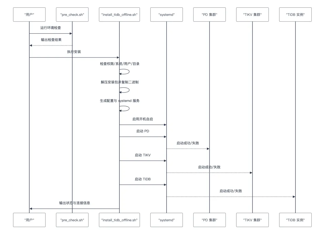 - 安装包检查脚本:列出安装包内容并校验关键二进制文件(pd-server、tikv-server、tidb-server)