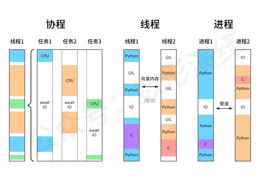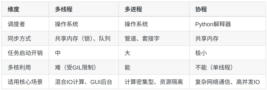 这三种多任务模式各有其适用边界与核心优势:多线程是IO密集型轻量任务的快速改造方案;多进程保证了计算密集型任务的性能,只是进程的启动与通信成本相对较高。