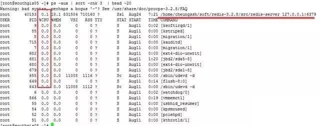 命令:# ps -aux | sort -rnk 3 | head -20