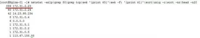 # netstat -anlp|grep 80|grep tcp|awk '{print $5}'|awk -F: '{print $1}'|sort|uniq -c|sort -nr|head -n20