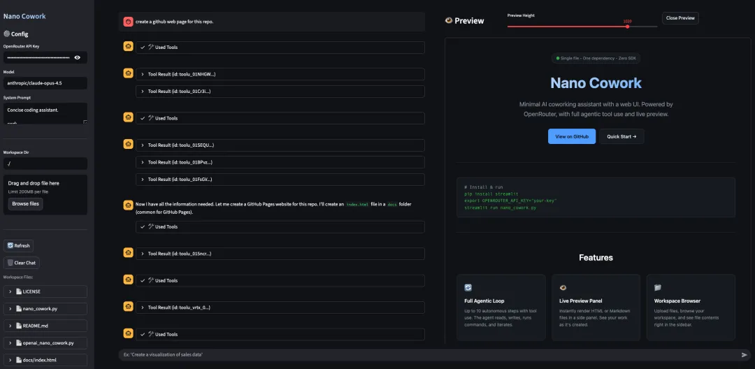 # 1. 安装唯一依赖pip install streamlit# 2. 设置API Key(去openrouter.ai注册)export OPENROUTER_API_KEY="your-key"# 3. 启动streamlit run nano_cowork.py