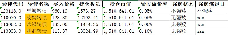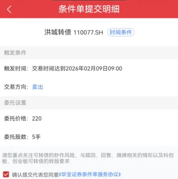 4只轮动策略,也就是上篇文章刚写过的,2月份跑了第一周,周收益0.18%(实际会高一些,因为程序跑的是按照周五收盘价换仓,实际执行的是周一开盘价换仓),可转债等权指数本周是0%,算是稍微超越些。【数据明细里只有收盘价,没办法按照开盘价回测】①跑上篇文章提到的python程序,输出最新持仓标的;其中惠城转债是需要新买入的,转股溢价率是5%。其它3只和上周一样;溢价率范围是5%-10%,普遍都是偏高,因为我的策略里的过滤条件相对较多,既然回测结果很棒,那就选择相信吧。以上是5天的日收益,当天新买入的时候亏损了1.65%,后面用4天的时间浮出了水面。以上是交易记录,可以清楚地看到本周4只转债的收益情况。收益最高的洪城转债,本周轮出,换成上面提到的惠城转债。核对了下实际的盈亏,凌钢的亏损1.03%,比程序跑的1.52%要好一些,原因是我选择的周一早上开盘价买入,125.17元。低于周五收盘价。以上使用了简单的时间条件单,到了周一的早上9点,自动会执行买卖操作。委托完成后,再次检查确认下无问题,调仓就算完成了。以上就是整个轮动的所有操作了,整体算是高效的,都是程序监控和条件单执行。周六是华宝的结算时间,因此没办法按照价格直接委托买卖,上面也是我第一次使用时间条件单【到时间触发一次就失效,也很省心高效】