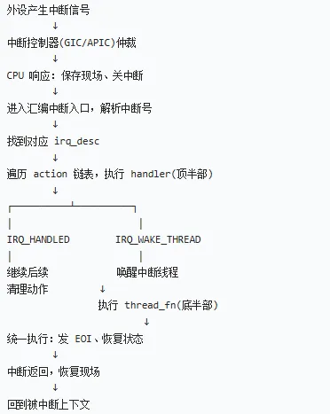 大家好,我是王鸽,这篇文章主要是讲Linux 中断管理之中断处理,分析中断触发,中断处理等整个流程,Linux 中断处理流程是一个从硬件信号触发到软件分级处理、最终恢复上下文的完整闭环,核心采用 “顶半部 + 底半部” 两级架构,以平衡响应速度与处理复杂度。完成中断的注册后,所有结构的组织关系都已经建立好,剩下的工作就是当信号来临时,进行中断的处理工作。外部硬件中断触发和硬件响应
