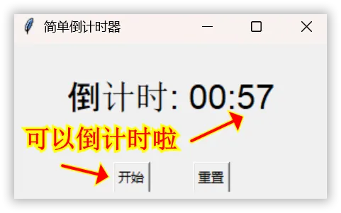 # 导入tkinter库,简化为tkimport tkinter as tk# 创建主窗口对象root = tk.Tk()root.title("简单倒计时器")root.geometry("300x150")# 倒计时初始秒数(60秒)total_seconds = 60# 时间转换函数:将秒数转为"分:秒"格式(两位数显示)def format_time(seconds): minutes = seconds // 60 # 计算分钟(整数除法) seconds = seconds % 60 # 计算剩余秒数(取余) return f"{minutes:02d}:{seconds:02d}" # 格式化显示# 核心倒计时函数def countdown(): global total_seconds # 声明使用全局变量 if total_seconds > 0: # 当秒数大于0时 total_seconds -= 1 # 秒数减1 # 更新时间标签文本 time_label.config(text=f"倒计时: {format_time(total_seconds)}") # 1000毫秒(1秒)后调用自身,实现循环倒计时 root.after(1000, countdown)# 创建时间标签,设置文本和字体样式time_label = tk.Label(root, text=f"倒计时: {format_time(total_seconds)}", font=("Arial", 24))time_label.pack(pady=30)# 创建按钮容器btn_frame = tk.Frame(root)btn_frame.pack(side=tk.BOTTOM, pady=10)# 创建开始按钮(绑定倒计时函数)和重置按钮start_btn = tk.Button(btn_frame, text="开始", command=countdown)reset_btn = tk.Button(btn_frame, text="重置")# 按钮网格布局start_btn.grid(row=0, column=0, padx=20)reset_btn.grid(row=0, column=1, padx=20)# 运行窗口循环root.mainloop()