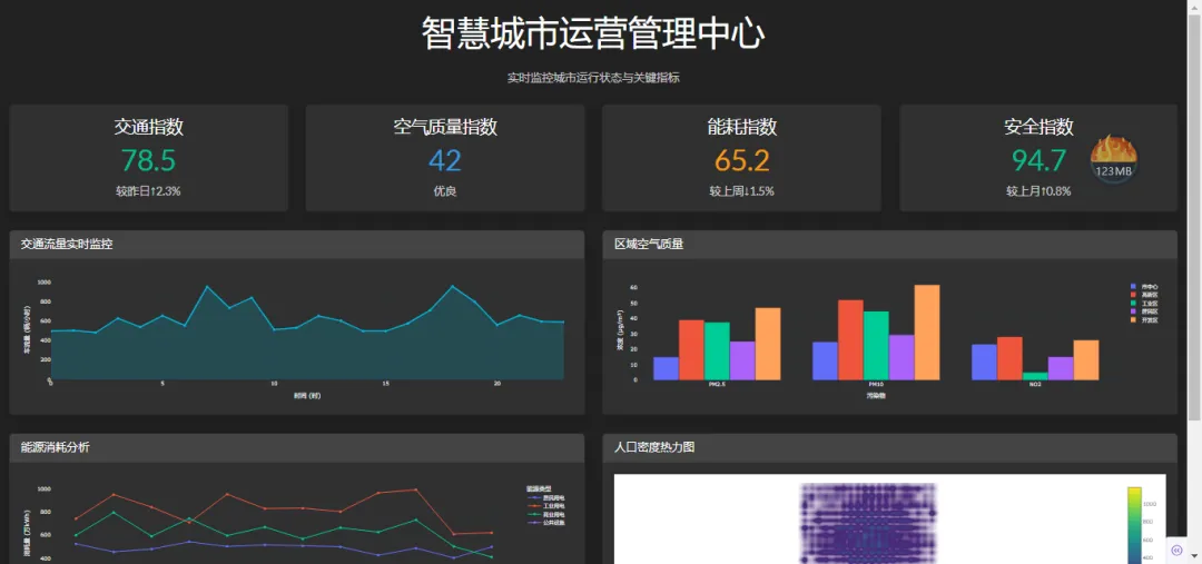 1.功能说明:KPI指标卡:显示交通指数、空气质量指数、能耗指数和安全指数。交通流量图:显示24小时交通流量变化趋势。空气质量图:比较不同区域的空气质量指标。能源消耗图:展示各类能源消耗的月度趋势