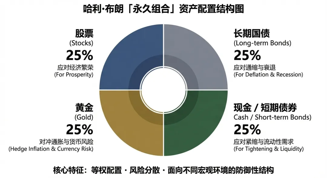 有些朋友可能对永久投资组合这个名词感到陌生,让我先来解释一下。哈利布朗(Harry Browne)是一位美国投资顾问和财经作家,他在上个世纪80年代提出了一种“极简”、“全天候避险”的资产配置策略;也就是大名鼎鼎的永久投资组合啦(Permanent Portfolio)。既然号称极简,那么它真的非常简单。这个组合将资产平均分成四个部分,每部分占比25%。它们分别是股票(Stock),长债(Long-term-Bonds),黄金(Gold),以及现金(Cash/Short-term Treasury)。具体原理按下不表,买入并持有这些资产后,我们需要做些什么呢?很简单,只需要定期(每季度或每年)再平衡一次即可;或者设定一个阈值,例如15%,35%当某项资产的比例超过35%或低于15%时,卖出多余的部分,买入亏损的部分。