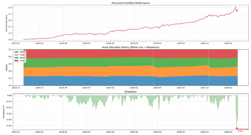 不到三年的时间里,总收益率达到了44.83%,年化收益率有17.71%,最大回撤-5.42%,发生在今年的2月2日。关注金融市场的朋友应该了解,当天黄金暴跌,全球股市震荡。回测期间一共再平衡两次,分别发生在2025年3月17日和2025年10月19日。再平衡的触发的原因都是黄金的权重超过了30%。