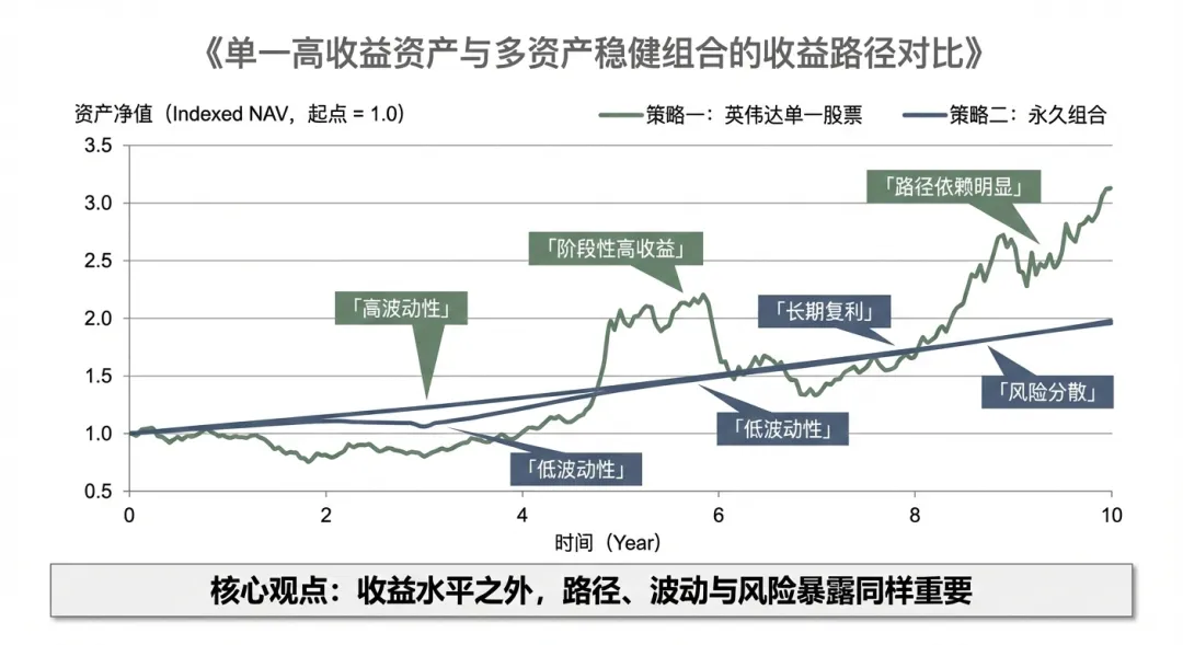 但其实这并不难理解,让我们重新回到回测图像,如果用一个短语形容永久组合那便是:“平庸的稳定”。想象一下,当你的朋友在饭桌上眉飞色舞地吹嘘:“我买英伟达一年翻了三倍!”或者“比特币一个月又涨了50%!” 而你看了一眼账户,你的永久组合今年只涨了 7%。