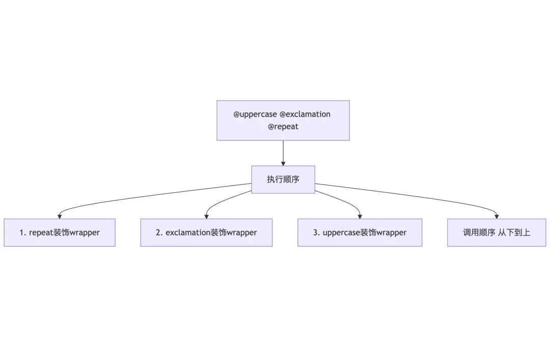 import functoolsdefuppercase(func): @functools.wraps(func)defwrapper(*args, **kwargs):return func(*args, **kwargs).upper()return wrapperdefexclamation(func): @functools.wraps(func)defwrapper(*args, **kwargs):return func(*args, **kwargs) + "!"return wrapper# 装饰器从下到上应用@uppercase@exclamationdefgreet(name):returnf"Hello, {name}"print(greet("World")) # HELLO, WORLD!!