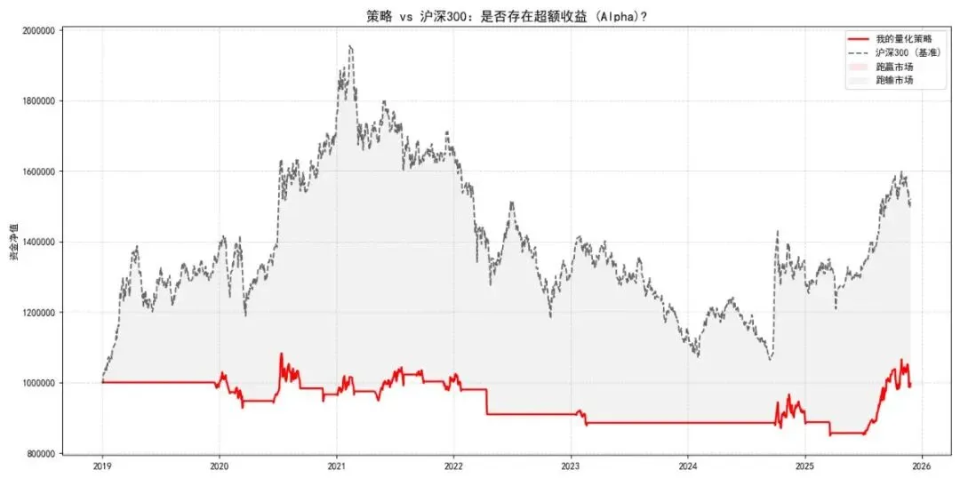 基准对比 (Benchmark Comparison):不跟大盘比收益的策略都是耍流氓。我们将把策略净值与“沪深300”的走势画在同一张图上,一目了然地看到你是否跑赢了市场。