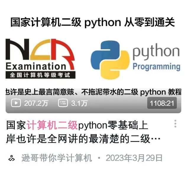 上周四我突然想起来给自己报了个python的计算机二级考试。零基础的我瞬间有点慌,想到是不是该学一学。打开B站看到这种课居然还挺多。既然我的目的单纯是为了过考试,我也没必要去买本书系统学了,所以我就点开了一个感觉很靠谱的up的视频。