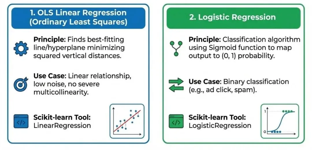 最基本的回归形式,旨在找到一条直线(或超平面),使得所有数据点到这条直线的垂直距离平方和最小。特征与目标变量呈线性关系,数据噪声较小,无严重多重共线性。Scikit-learn工具:LinearRegression2. 逻辑回归 (Logistic Regression)