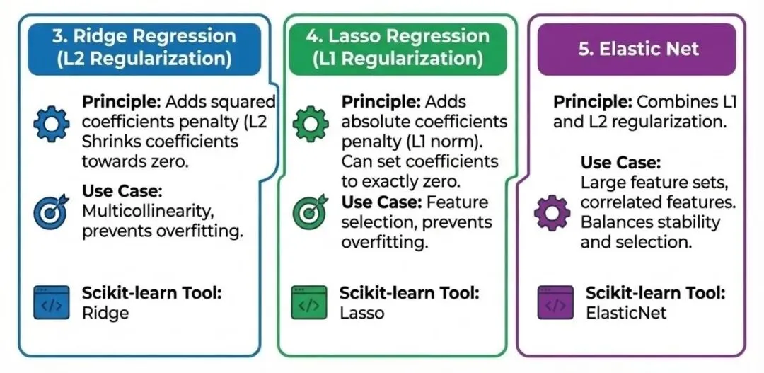 虽然名字里有“回归”,但它实际上是一种分类算法。它通过 Sigmoid 函数将线性回归的输出映射到 (0, 1) 区间,用于估计概率。二分类问题(如:用户是否点击广告,邮件是否为垃圾邮件)。Scikit-learn工具:LogisticRegression二、 正则化回归 (Regularized Regression):应对过拟合