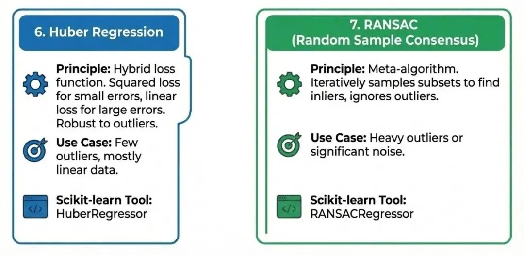 现实数据往往不干净,包含离群点(Outliers)。普通的线性回归很容易被这些极端值“带偏”。6. Huber 回归 (Huber Regression)