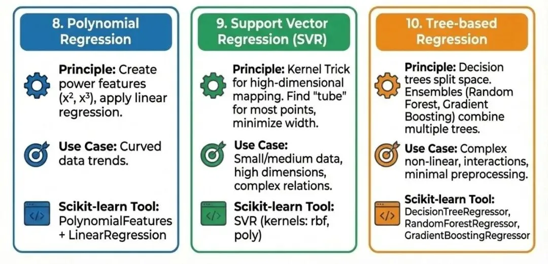 利用核函数(Kernel Trick)将数据映射到高维空间,试图找到一个“管道”,使得大部分数据点都包含在管道内,并最小化管道的宽度。Scikit-learn工具:SVR (常用核函数如 rbf, poly)10. 基于树的回归 (决策树/随机森林/梯度提升)