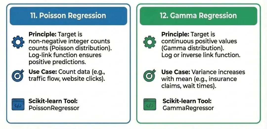 目标变量服从泊松分布,即非负整数值(计数数据),且满足"均值=方差"的特性。通过对数连接函数将线性预测值与均值连接,确保预测值始终为正。目标变量是计数数据(例如:某路口一小时内的车流量、网站一天的点击量)。Scikit-learn工具:PoissonRegressor12. Gamma 回归 (Gamma Regression)