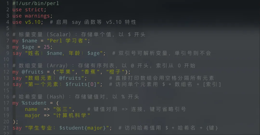 Perl 变量以符号区分类型,无需声明数据类型,开启 strict 后需用 my 声明局部变量: