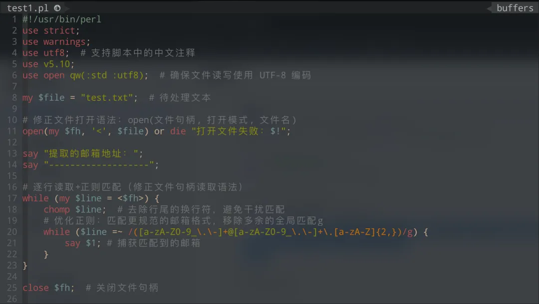 Perl 最擅长文本处理,正则表达式深度集成,下面以「提取文本中所有邮箱」为例,演示实用脚本: