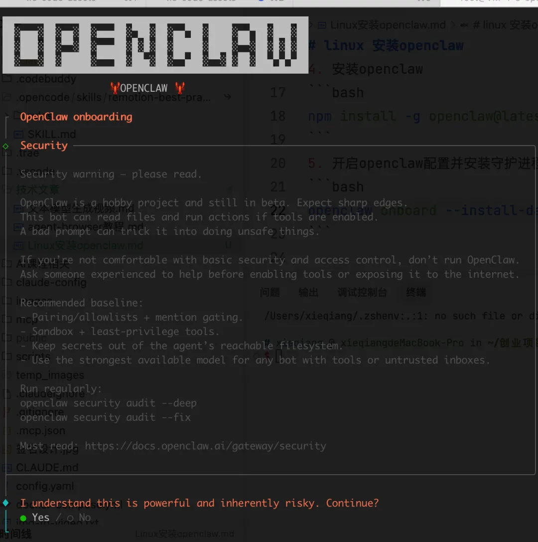 - 开启openclaw配置并安装守护进程。执行该命令后,会进入交互向导。