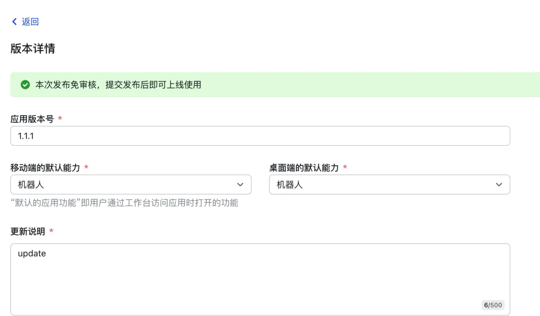 - 创建版本并发布机器人