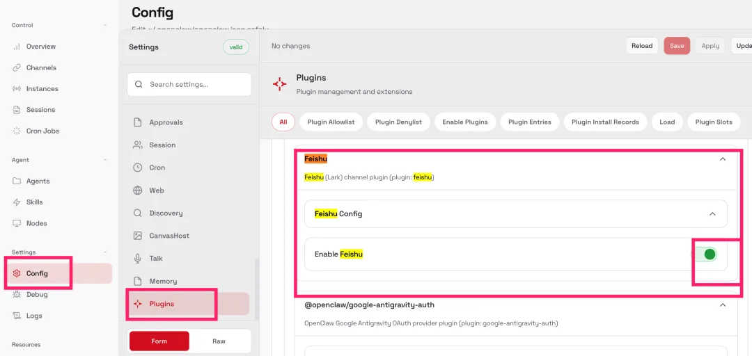 启用飞书插件