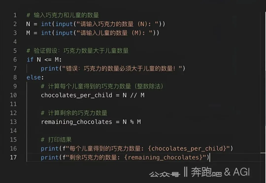 分到的巧克力数量%运算符用于取模运算,计算无法均分的剩余巧克力
