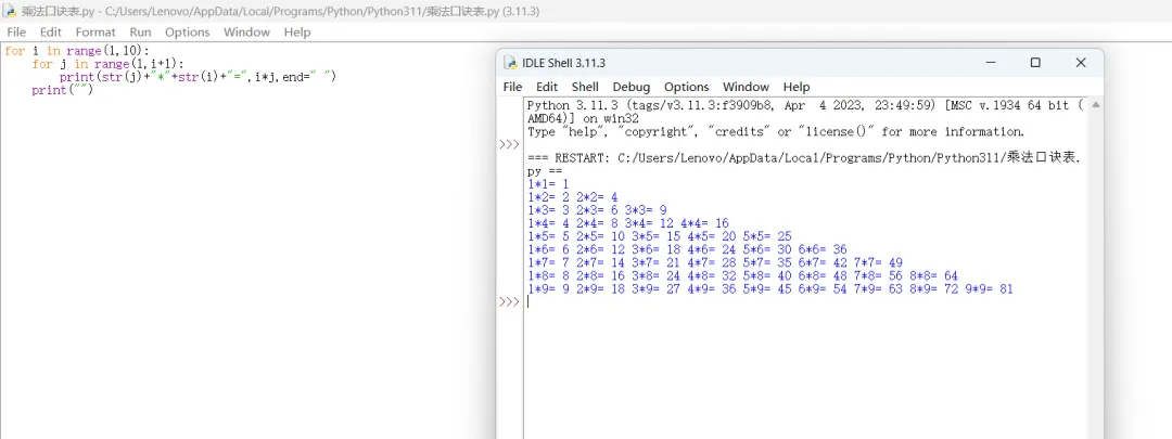 (2)步长可以为负值,需要根据实际情况调整初值和终值,即初值大于终值。(2)双循环语句中的内循环语句依次向后缩进一个Tab键位置。(3)str( )为转换函数,将数值型数据转换为字符型数据。(4)print(“”)语句的含义是强制换行。使用时注意其所在的位置,位置不同,含义不同。说明:本例中代码的变化如下。