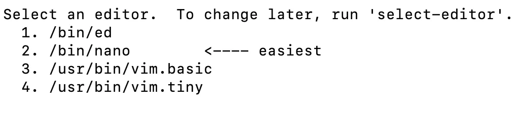 我开始直接回车就选择了nano 这个编译器,说真的这个编译器我是用不习惯的,并且这个界面看着也非常的别扭,而且每次打开crontab,都是用这个编译器。