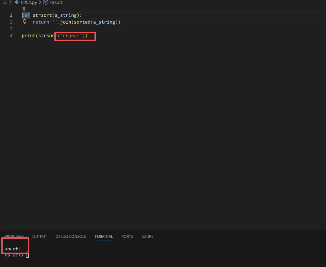 def strsort(a_string): return ''.join(sorted(a_string))print(strsort('cbjeaf'))