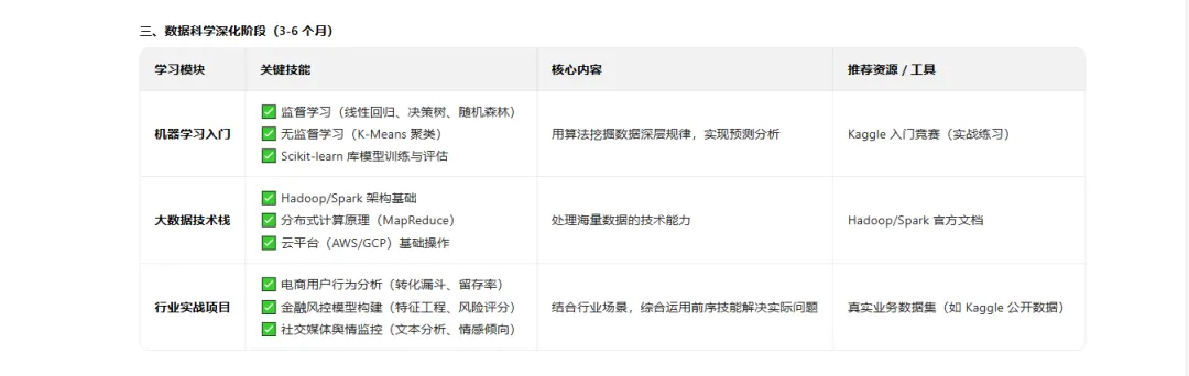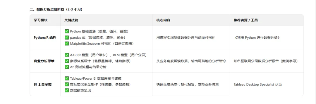 这步我还在眺望,算是我的“愿望清单”。比如试着用Python做点简单的销量预测(机器学习入门),或者了解一下大数据平台是咋回事。不一定真成为专家,但要知道世界已经走到哪了,自己别掉队。