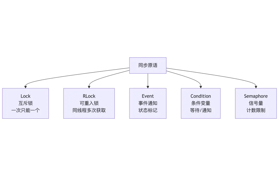 import asyncio# Lock - 异步锁asyncdefasync_task(lock, name):asyncwith lock: print(f"{name} acquired lock")await asyncio.sleep(0.5) print(f"{name} released lock")asyncdefmain(): lock = asyncio.Lock()await asyncio.gather( async_task(lock, "A"), async_task(lock, "B") )asyncio.run(main())# Semaphore - 限制并发数asyncdeflimited_task(semaphore, n):asyncwith semaphore: print(f"Task {n} started")await asyncio.sleep(1) print(f"Task {n} completed")asyncdefmain(): sem = asyncio.Semaphore(2) # 最多2个并发await asyncio.gather( *[limited_task(sem, i) for i in range(5)] )asyncio.run(main())